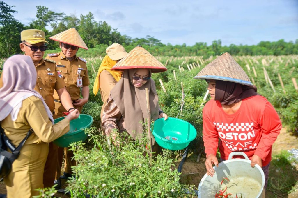 Bupati Mesuji Hj. Elfianah didampingi Sekretaris Daerah Kabupaten Mesuji Budiman Jaya melaksanakan panen cabai di Desa Mekar Jaya, Kecamatan Tanjung Raya, Selasa (16/12/2025).